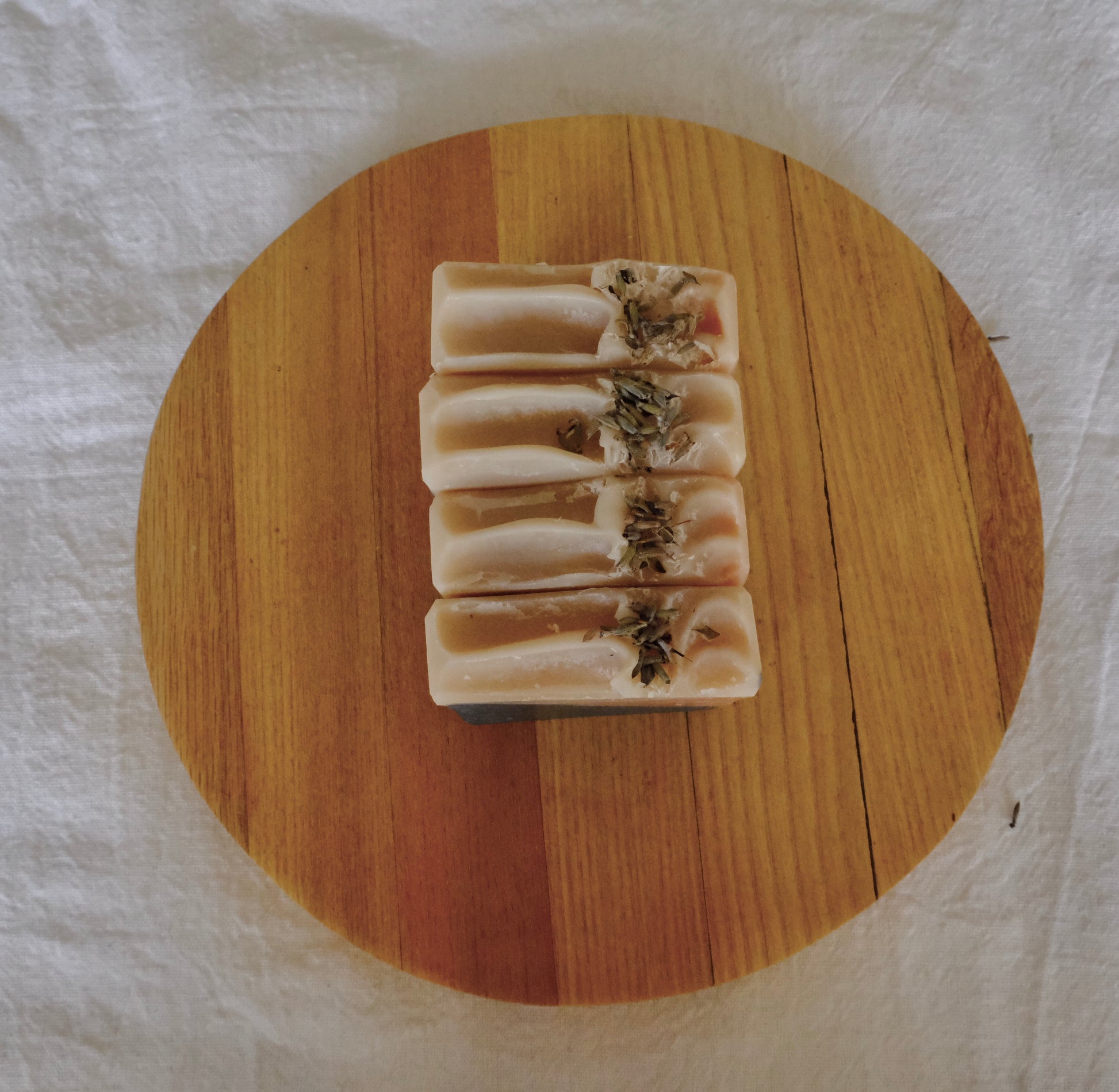 This soap is scented with French lavender essential oil. Lavender has been known to help with anxiety or trouble sleeping, it also has anti-inflammatory and anti-bacterial properties.